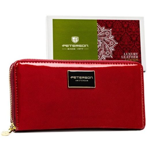 Duży portfel damski z lakierowanej skóry naturalnej w czerwonym kolorze zamykany suwakiem Peterson PTN PH25-1-SAF