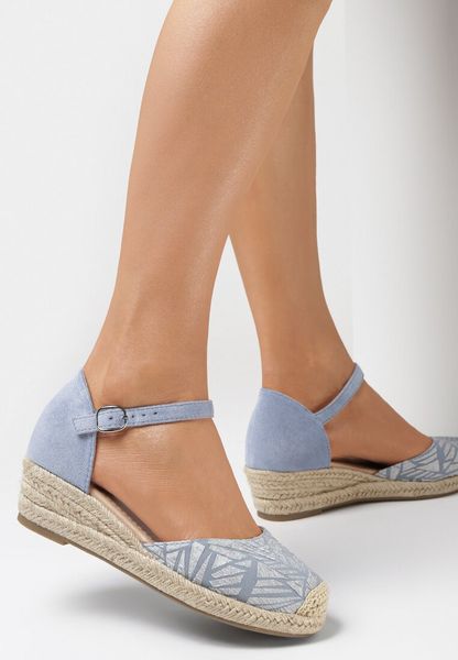 Espadryle Callolea na koturnie i grubej podeszwie. Ozdobione jutową plecionką wokół podeszwy i na okrągłym nosku. Zabudowane na palcach i pięcie. Z odkrytymi bokami. Zapinane na sprzączkę znajdującą się na wysokości kostki. Wykonane z ekozamszu i materiału tekstylnego. Urozmaicone w przedniej części tłoczeniami. To model idealny na wiosnę i lato.