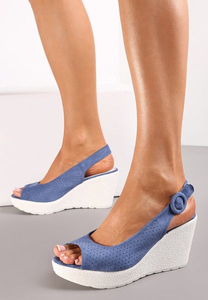 Niebieskie Sandały na Koturnie z Cholewką z Perforacją i Odkrytym Noskiem Aldonie