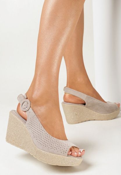 Ciemnobeżowe Sandały na Koturnie ze Sprzączką i Skórzaną Wkładką Chera