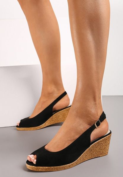 Czarne Sandały z Zapięciem na Sprzączkę i Otwartym Noskiem na Koturnie Soelira