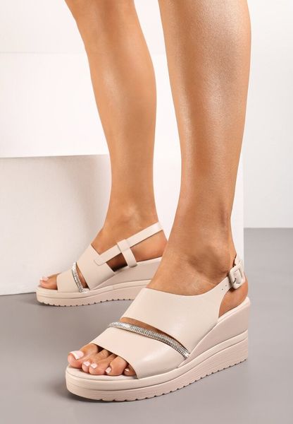 Beżowe Sandały na Koturnie z Odkrytą Piętą Zapinane na Sprzączkę z Przodu Ozdobione Cyrkoniami Azinarea