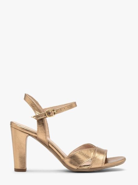 Złote sandały na obcasie z linii RYŁKO.Model wykonany ze skóry licowej foliowanej.Podszewka i wyściółka skórzana.Słupek oblekany o wysokości 8,5 cm.Wysokość obcasa uśredniona dla rozmiaru 37.But posiada ozdobną klamerkę w kolorze złotym.Dystrybutor: Brawo Sp. z o.o. ul. Dworcowa 19, 34-130 Kalwaria Zebrzydowska; [email protected] pochodzenia: POLSKA