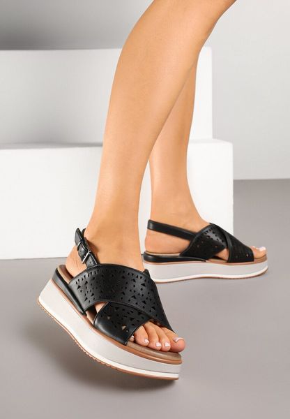 Czarne Sandały na Koturnie Ozdobione Ażurowym Wzorem Nevola