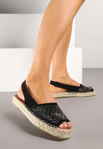 Czarne Sandały w Stylu Espadryli z Cyrkoniami na Podeszwie z Plecionki Neorwena