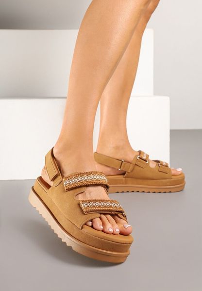 Brązowe Sandały na Niskiej Platformie z Zapięciem na Rzep Zdobione Haftem Soreze