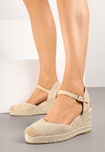 Ciemnobeżowe Sandały w Stylu Espadryli na Plecionym Koturnie Reflara