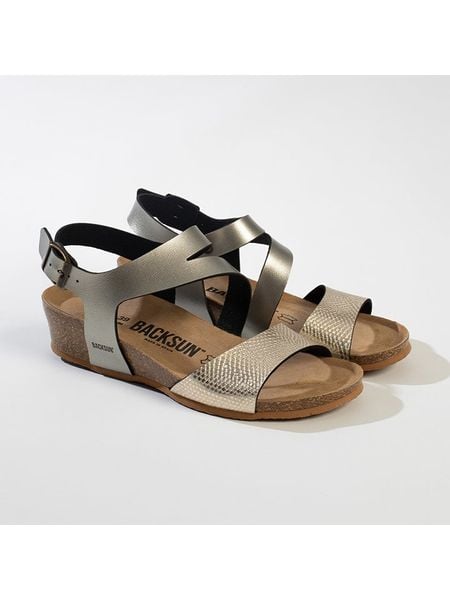 – materiał wierzchni ze skóry syntetycznej- zapięcie: sprzączka- noski: otwarte- skórzana wkładka: ergonomicznie formowana- powierzchnia: z metalicznym połyskiem – forma obcasa: koturny- podeszwa: antypoślizgowa- wyprodukowano w Hiszpanii