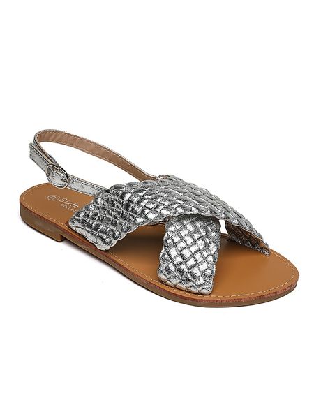 – zapięcie: sprzączka- noski: otwarte- powierzchnia: z metalicznym połyskiem- detale: plecionka- podeszwa: antypoślizgowa