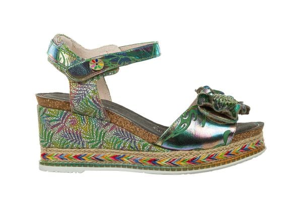 Sandały francuskiej marki Laura Vita w kolorze wielokolorowym z przeważającą zielenią.Model Hacdeo 09 to damskie sandały na koturnie w mieniące się odcienie zieleni, niebieskiego i fioletu przeplatane z roślinnymi wzorami.Paski wykonane z naturalnej skóry.Anatomiczna, miękka wkładka z pianki „Memory Foam” z materiału.Koturn z lekkiego korka, który amortyzuje kroki. Ozdobiony plecionką w żywych kolorach Gumowa podeszwa […]
