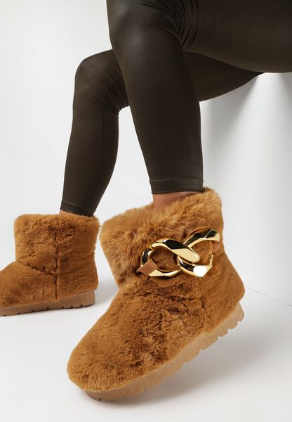 Śniegowce Clymope na grubej, płaskiej podeszwie z bieżnikiem. Cholewka sięgająca za kostkę. Z okrągłym noskiem. Wsuwane, udekorowane na boku grubym łańcuchem w złotym kolorze. Wykonane z puszystego materiału imitującego futerko. Mocno ocieplane od środka imitacją futerka. Sugerujemy zakup rozmiaru o 1 większego. Futrzane śniegowce z łańcuchem dodadzą zimowym stylizacją supermodny charakter!