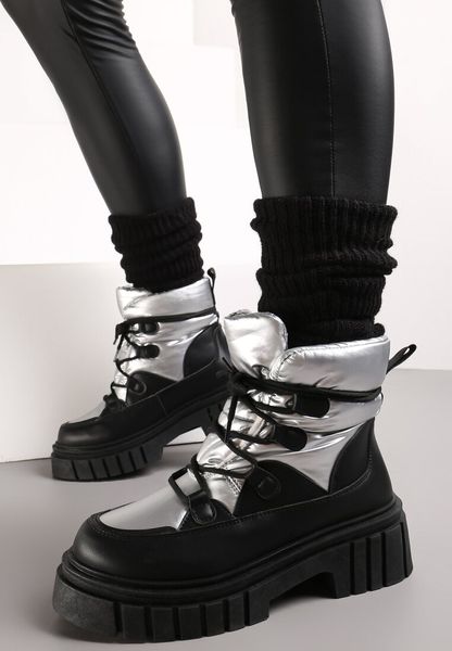 Czarno-Srebrne Sznurowane Śniegowce na Masywnej Podeszwie Pervenna