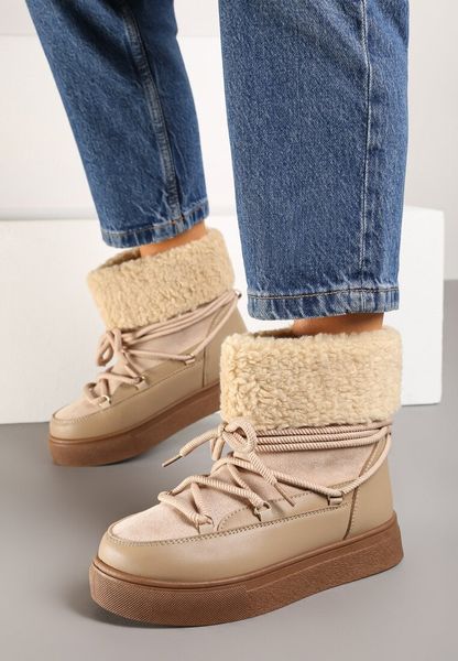 Ciemnobeżowe Śniegowce na Grubej Podeszwie ze Sznurowaniem i Futerkiem Izantea