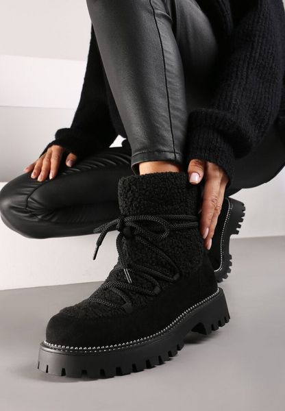 Czarne Futerkowe Śniegowce na Tłoczonej Podeszwie Ozdobionej Cyrkoniami Rialuna