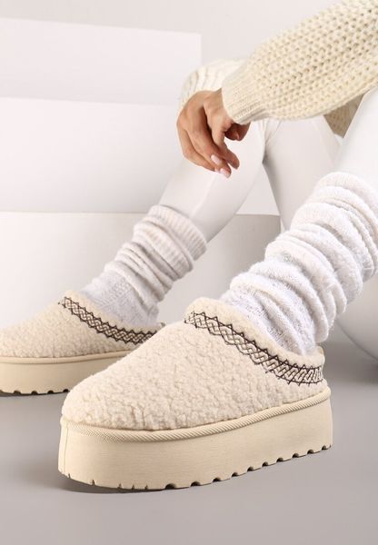 Beżowe Niskie Śniegowce na Grubej Podeszwie Ozdobione Barankowym Futerkiem i Wzorzystym Przeszyciem Aziara