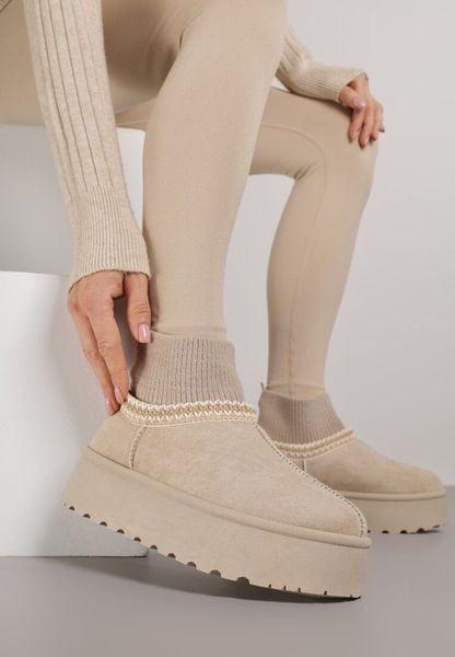 Beżowe Śniegowce VICES na Grubej Podeszwie z Haftem i Skarpetkową Cholewką Enantia