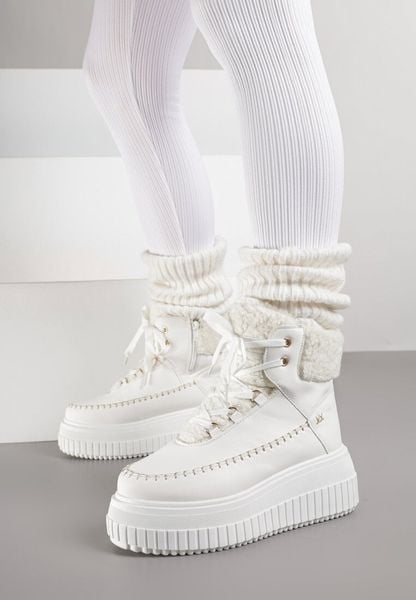 Białe Śniegowce na Grubej Tłoczonej Platformie z Futerkiem i Przeszyciami Emirio
