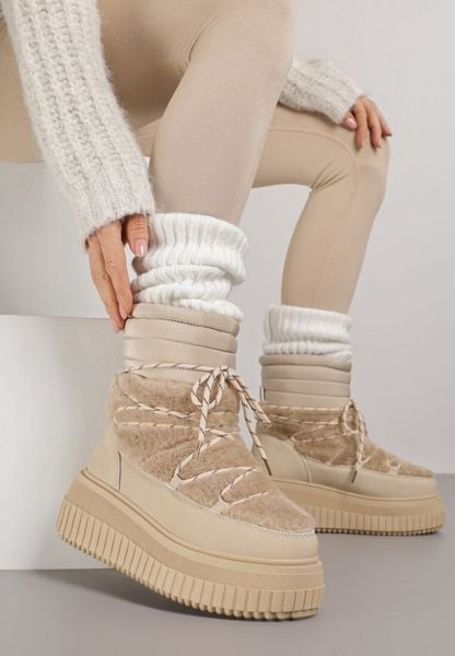 Ciemnobeżowe Pikowane Śniegowce na Grubej Tłoczonej Podeszwie z Futerkiem Adarlia