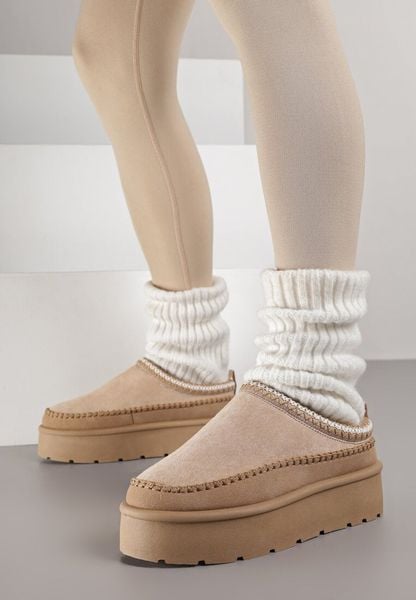 Ciemnobeżowe Śniegowce Ocieplone na Platformie z Ozdobnym Wyszywaniem Reitenna