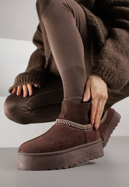 Brązowe Śniegowce VICES na Grubej Podeszwie z Haftem i Skarpetkową Cholewką Enantia