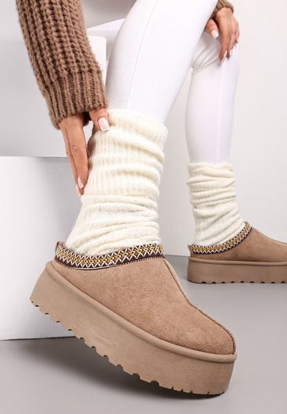 Ciemnobeżowe Krótkie Śniegowce na Platformie Ozdobione Haftowaną Lamówką Brandise