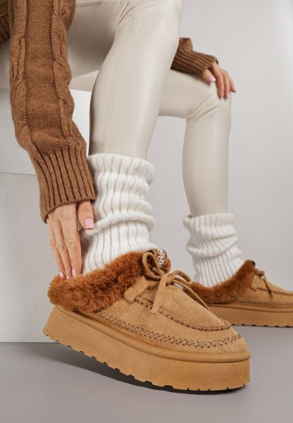 Brązowe Wsuwane Śniegowce w Rustykalnym Stylu z Kokardą i Futrem Tusora