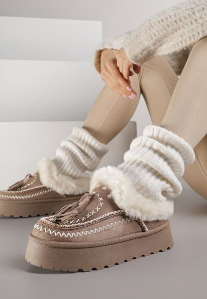 Ciemnobeżowe Śniegowce na Platformie Ozdobione Frędzlami i Haftem Ezivelle