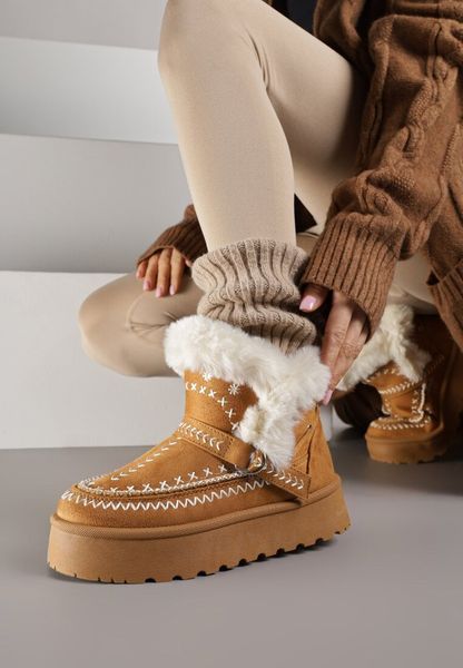 Jasnobrązowe Śniegowce na Platformie z Futerkiem i Haftowanym Wzorem Celatusa