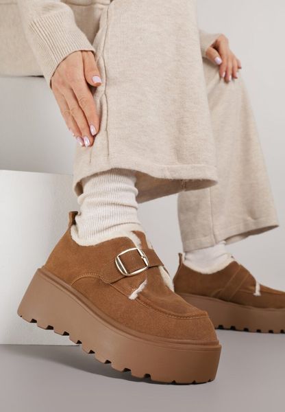 Tęgość stopy: Neutralny, Rodzaj obcasa: Platforma, Ocieplenie: Mocno ocieplany, Wkładka/wyściółka: Sztuczne futro, Materiał: Imitacja zamszu, Nosek buta: Okrągły, Zapięcie: Sprzączka, Sezon: Zimowy, Kod produktu: 402054, Kolor: Brązowy