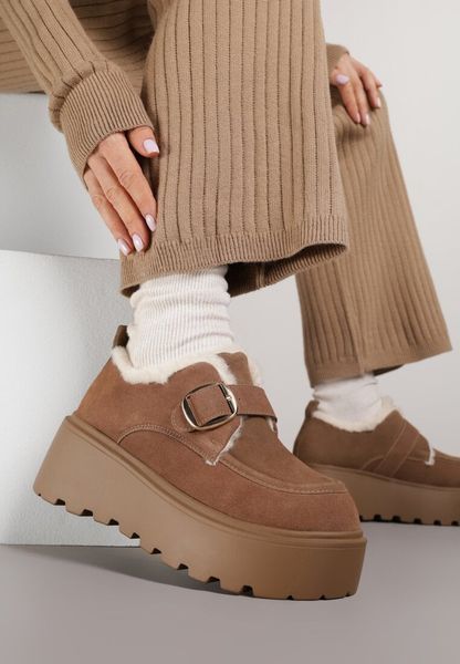 Tęgość stopy: Neutralny, Rodzaj obcasa: Platforma, Ocieplenie: Mocno ocieplany, Wkładka/wyściółka: Sztuczne futro, Materiał: Imitacja zamszu, Nosek buta: Okrągły, Zapięcie: Sprzączka, Sezon: Zimowy, Kod produktu: 402067, Kolor: Brązowy