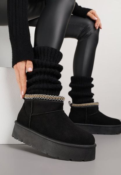 Czarne Śniegowce na Platformie z Haftem przy Cholewce Sewnera