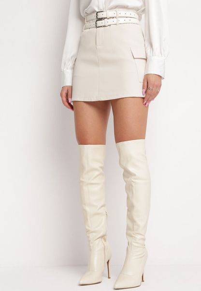 Beżowa Spódnica Mini z Kieszeniami i Paskami z Ekoskóry Svanna