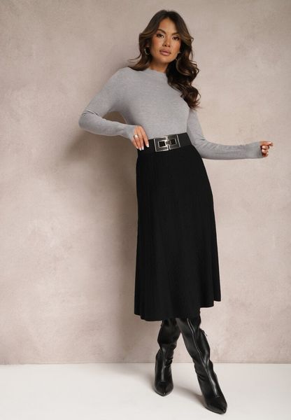 Czarna Rozkloszowana Spódnica Midi ze Sweterkowego Tłoczonego Materiału i Gumką w Pasie Tuilera