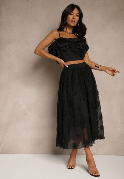 Czarna Tłoczona Spódnica o Rozkloszowanym Kroju z Gumką w Pasie Folunetta