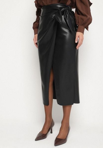Czarna Kopertowa Spódnica z Imitacji Skóry z Wiązaniem i Marszczeniem Seolisse