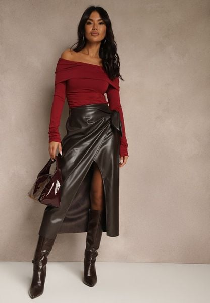 Brązowa Marszczona Spódnica z Imitacji Skóry o Kopertowym Kroju z Wiązaniem Seoselle