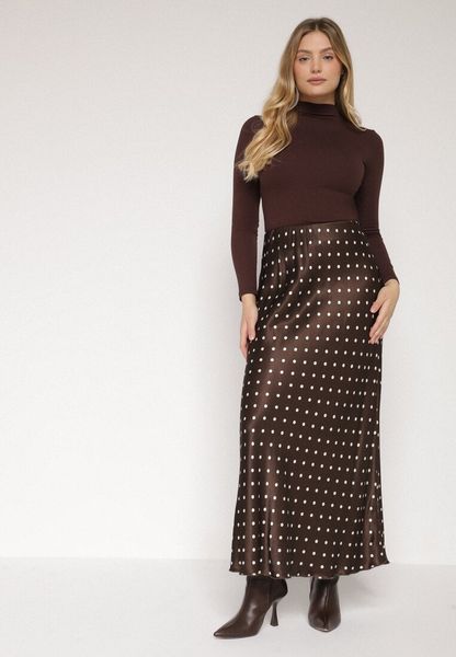 Brązowa Wiskozowa Spódnica Satynowa w Kropki o Rozkloszowanym Kroju Fedrana