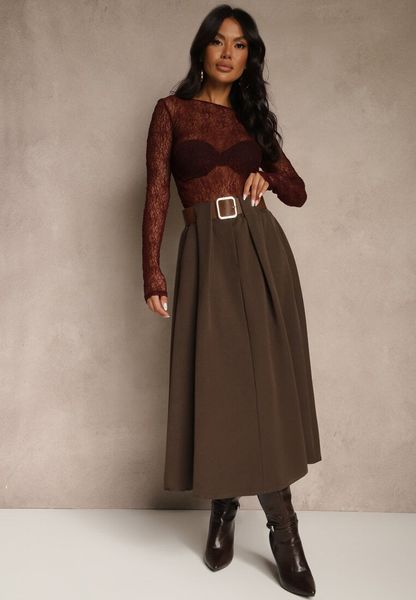Brązowa Spódnica z Wiskozą o Rozkloszowanym Kroju z Paskiem z Klamrą Tiavela