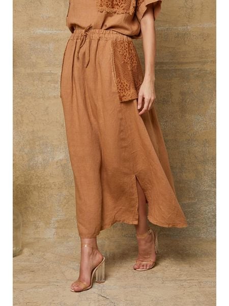– z dodatkiem lnu- wysokość pasa: high waist- pas: ściągacz tunelowy- dolny brzeg: z rozcięciem- detale: szydełkowana koronka- krój: luźny- look: jednokolorowy