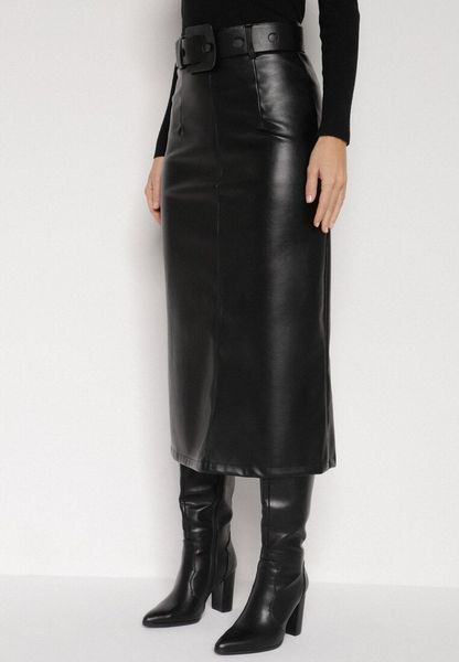 Czarna Spódnica Ołówkowa z Imitacji Skóry z Paskiem z Dużą Klamrą Rewedia