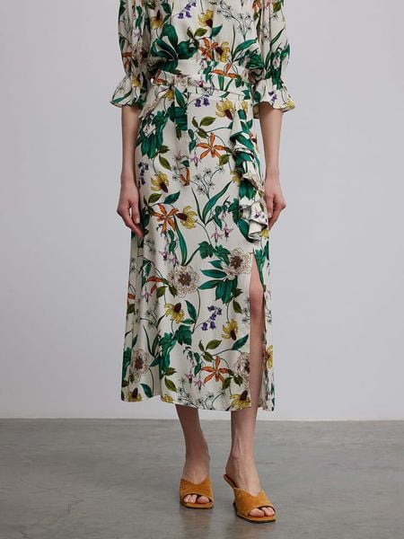 – czysta wiskoza- wysokość pasa: high waist- zapięcie: suwak- dolny brzeg: z rozcięciem- krój: prosty- wzór: kwiatowyUwaga: Przy wyborze właściwego wariantu zaleca się korzystanie z tabeli rozmiarów.