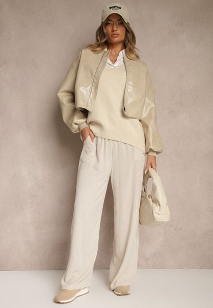 Beżowe Szerokie Spodnie z Wiskozą z Gumką w Pasie Lealirre