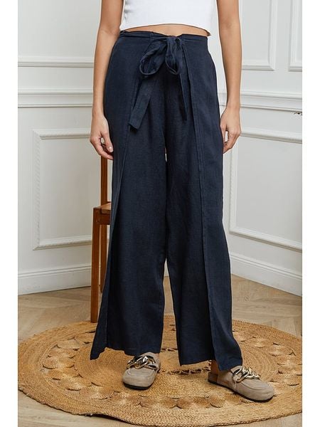 – czysty len- pas / ściągacz: elastyczny- zapięcie: sznurowanie- zakończenia nogawek: dzwony- krój: prosty- look: jednokolorowy