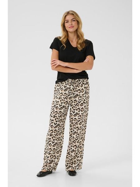 – czysty len- pas: ściągacz tunelowy- kieszenie: wpuszczane- zakończenia nogawek: dzwony- krój: prosty- wzór: panterka