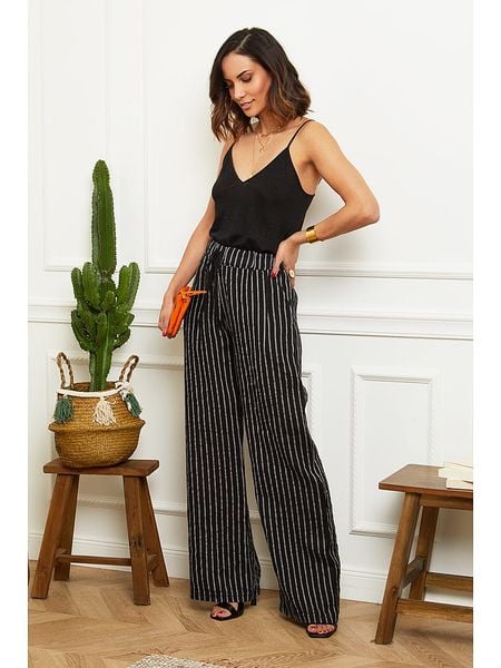 – czysty len- wysokość pasa: high waist- pas: ściągacz tunelowy- kieszenie: wpuszczane- krój: luźny- wzór: paskiUwaga: Na metkach odzieży tej marki znajdują się rozmiary francuskie. Rozmiarówka została przez nas przeliczona. Podane do wyboru warianty rozmiarów odpowiadają standardowym europejskim rozmiarom konfekcji. Prosimy zapoznać się z zamieszczonym objaśnieniem rozmiarów.