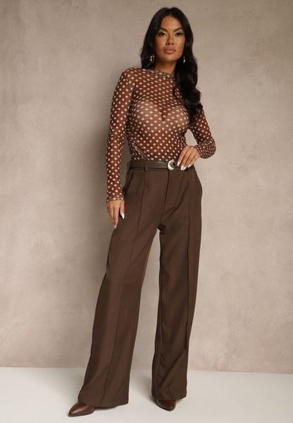 Brązowe Szerokie Spodnie Garniturowe z Paskiem ze Sprzączką Muszelką Salanva