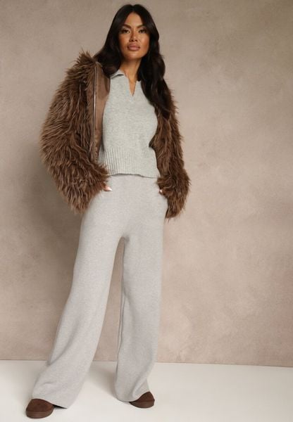 Szare Szerokie Spodnie Dzianinowe Ozdobione Sznurkami Meretusa