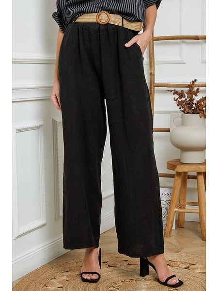 – czysty len- pas / ściągacz: elastyczny- szlufki na pasek: tak- zdejmowany pasek: tkanina- kieszenie: wpuszczane- zakończenia nogawek: dzwony- krój: prosty- look: jednokolorowy