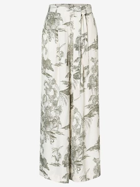 – wysokość pasa: high waist- zapięcie: wiązane tasiemki- kieszenie: wpuszczane i tylne- zakończenia nogawek: dzwony- krój: luźny- wzór: na całości