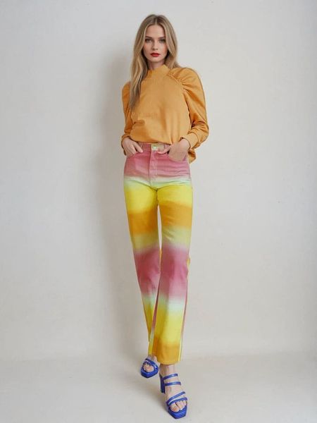 – wysokość pasa: high waist- fason: regular fit- krój nogawek: prosty- szlufki na pasek: tak- zapięcie: guzik i suwak- kieszenie: wpuszczane i tylne- wzór: przejście kolorów